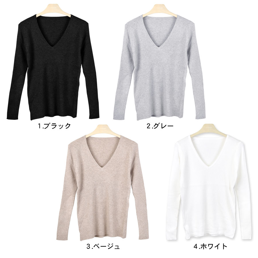 Vネック リブ ニットソー ニット カットソー 深Vネック レディース トップス 長袖 伸び 【送料pt100】