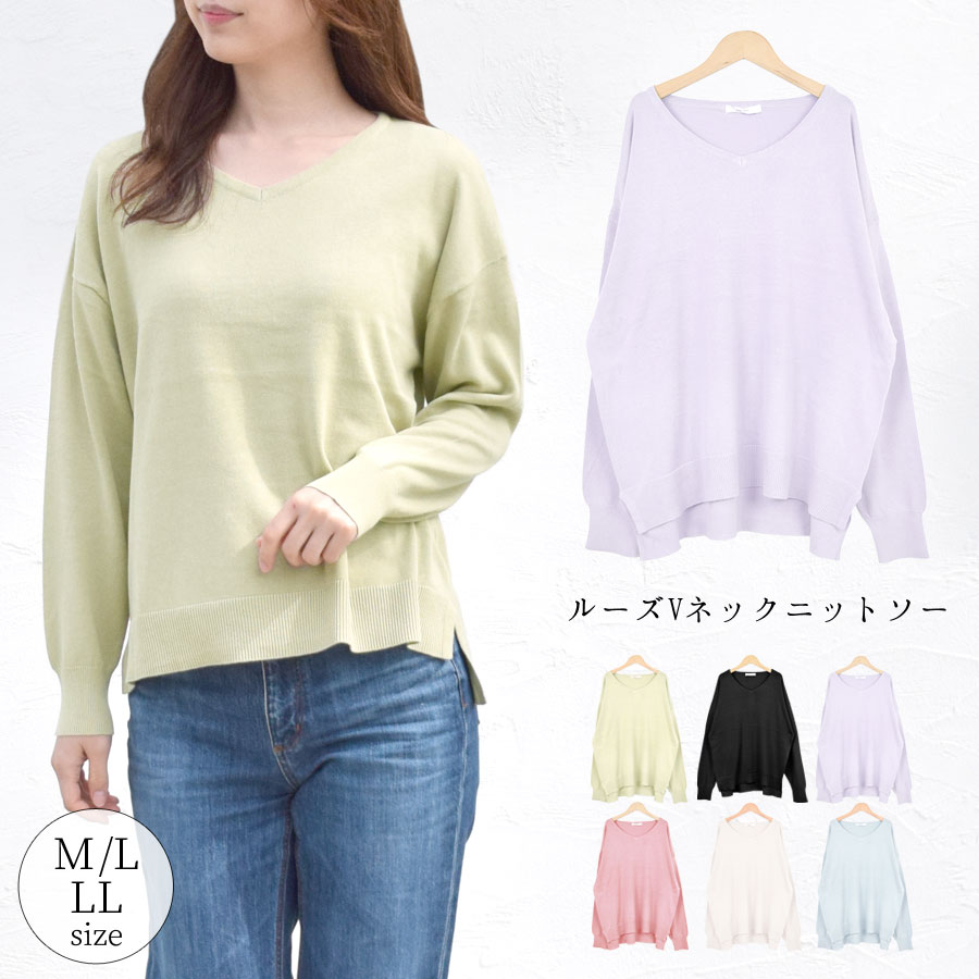 ニット セーター レディース トップス 長袖 Vネック ニットソー ゆる ゆったり ルーズ シンプル 【送料pt100】