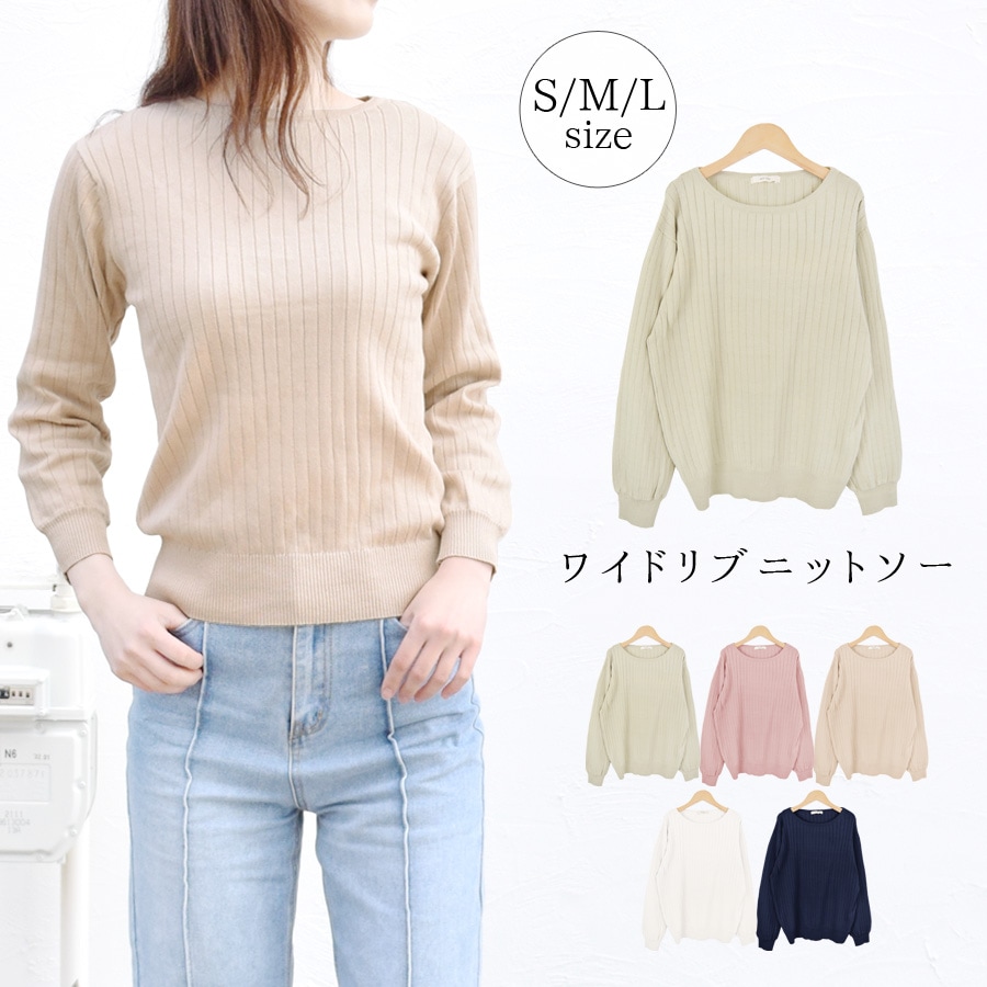 ニット ワイドリブ トップス セーター レディース 長袖 薄手 クルーネック ニットソー シンプル 【送料pt100】