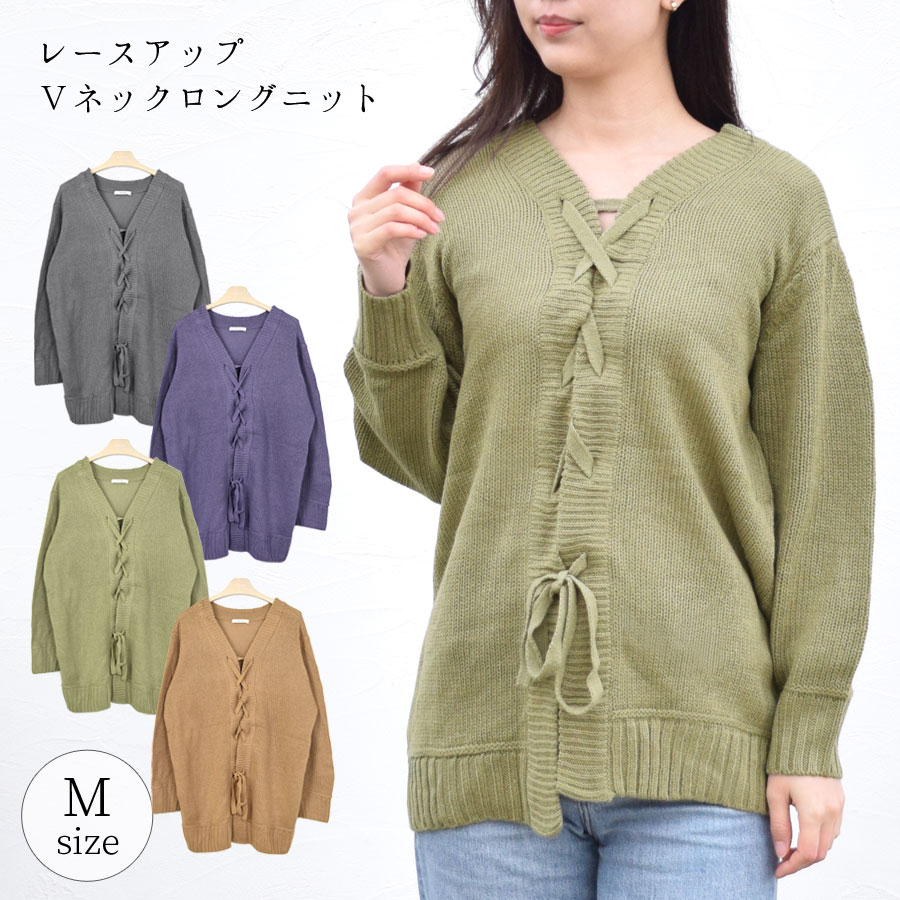 ニット セーター ざっくり Vネック レースアップ ロング丈 レディース トップス 長袖 ワイド 【送料pt100】