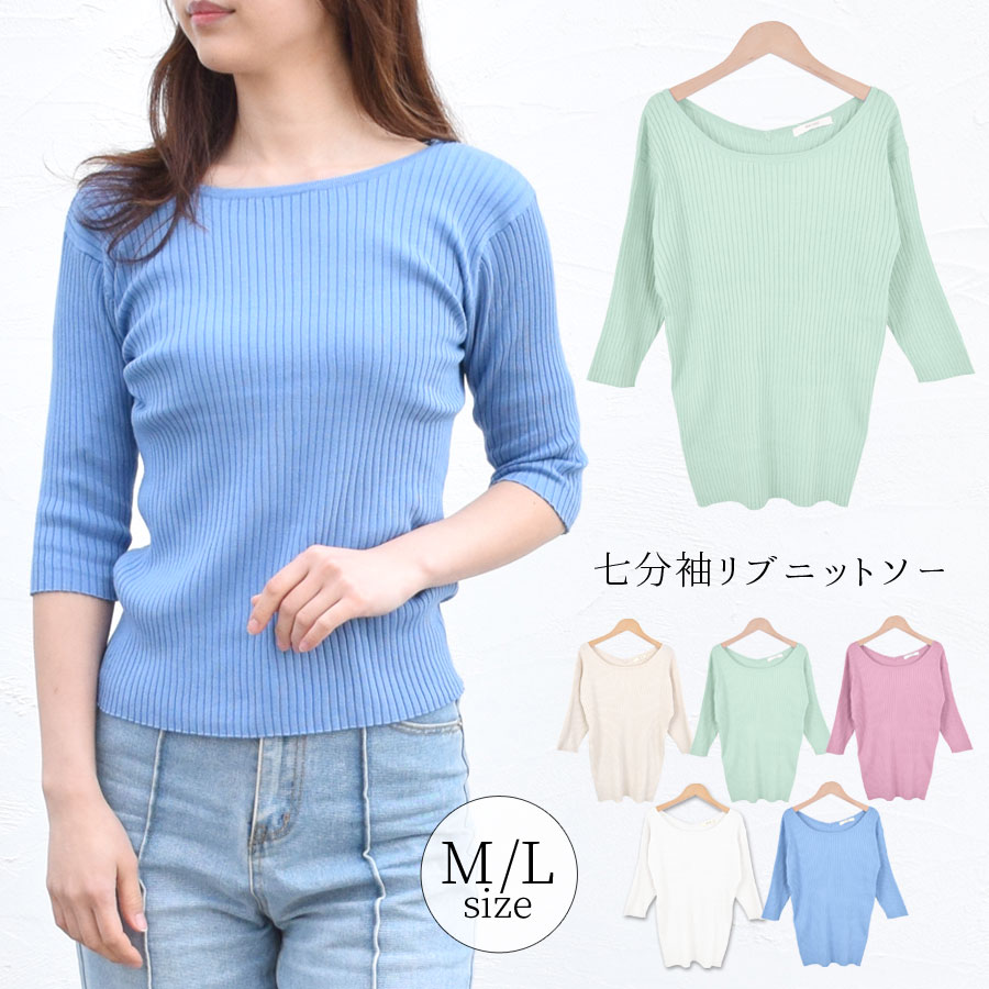 ニットソー リブ ニット カットソー 七分袖 レディース トップス ワイドリブ 伸縮性 ストレッチ 【送料pt100】