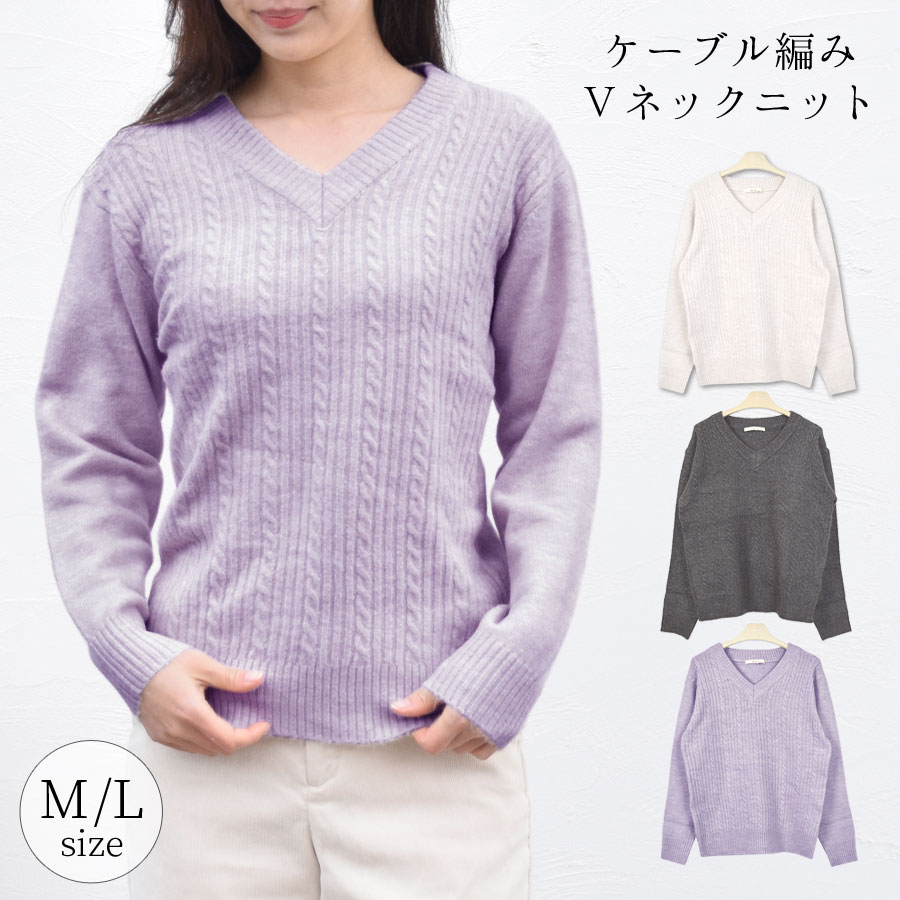 ニット セーター ケーブル編み Vネック ざっくり レディース トップス 長袖 シンプル カジュアル 【送料pt100】