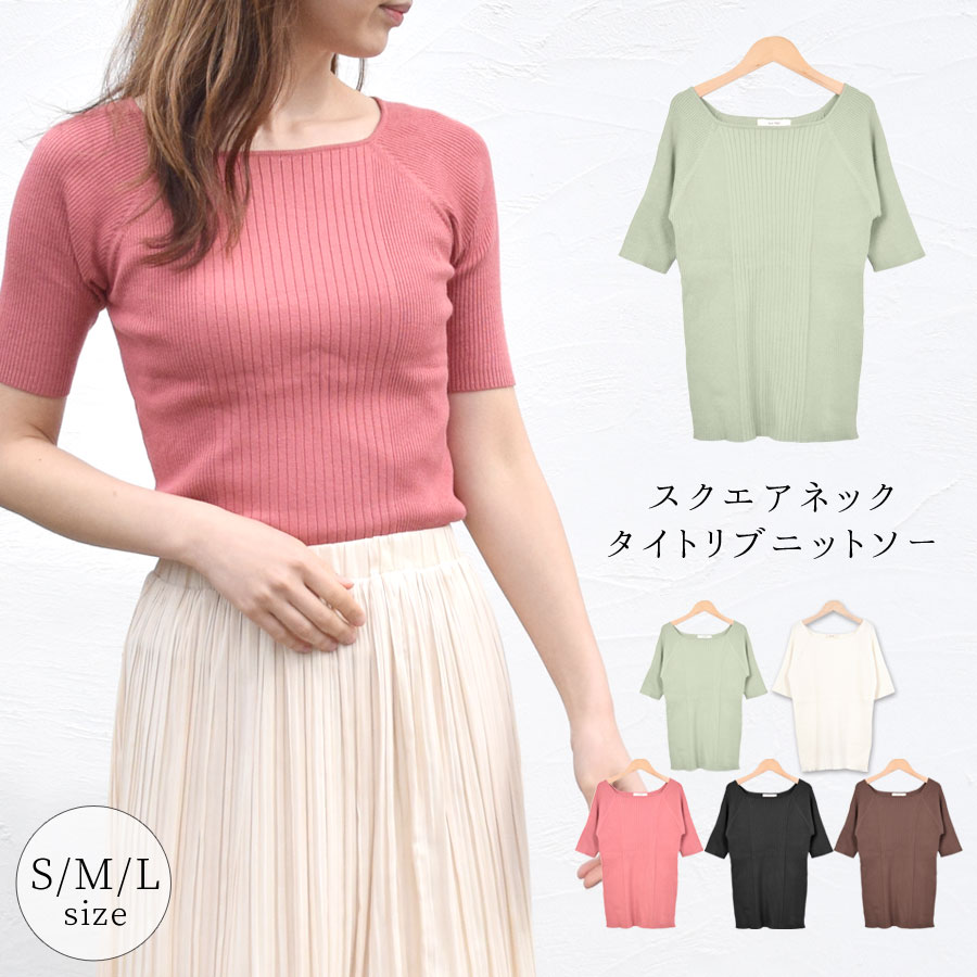 リブニット ニットソー タイト スクエアネック 五分袖 レディース トップス カットソー きれいめ 【送料pt100】
