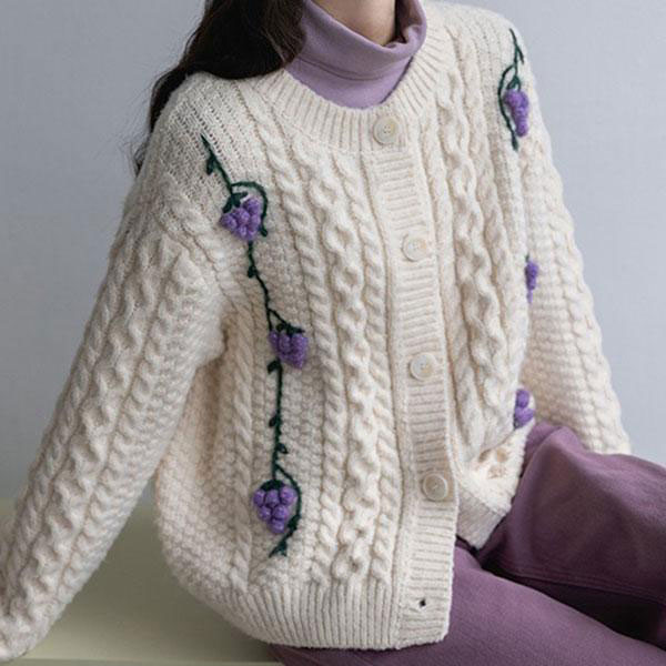レディース 長袖 レトロ ニット カーディガン 2カラー 可愛い ケーブル編み ぶどうモチーフ アウター ジャケット セーター 春...
