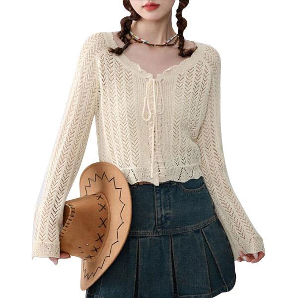 レディース カーディガン ケーブル編み&透かし編み フリーサイズ アクセント エレガント 首回りスッキリ リボン結び袖 カジュアル...
