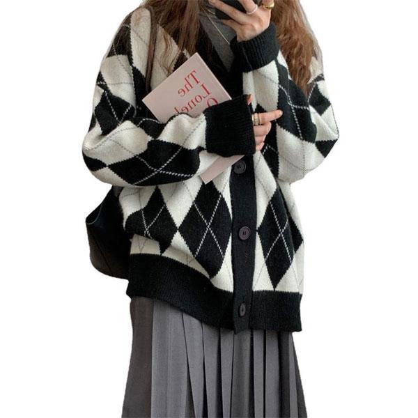 レディース アーガイル柄 カーディガン 長袖 アウター フリーサイズ ニット ボリューム オーバーサイズ リラックス スタイル 可...