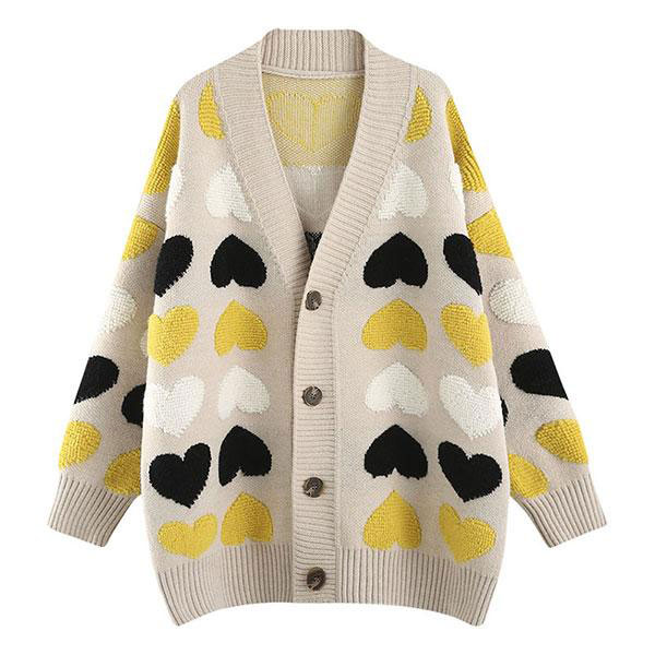 レディース ハート柄 オーバーサイズ 長袖 ニットカーディガン フリーサイズ カジュアル 可愛らしい ゆったりシルエット スタイリ...