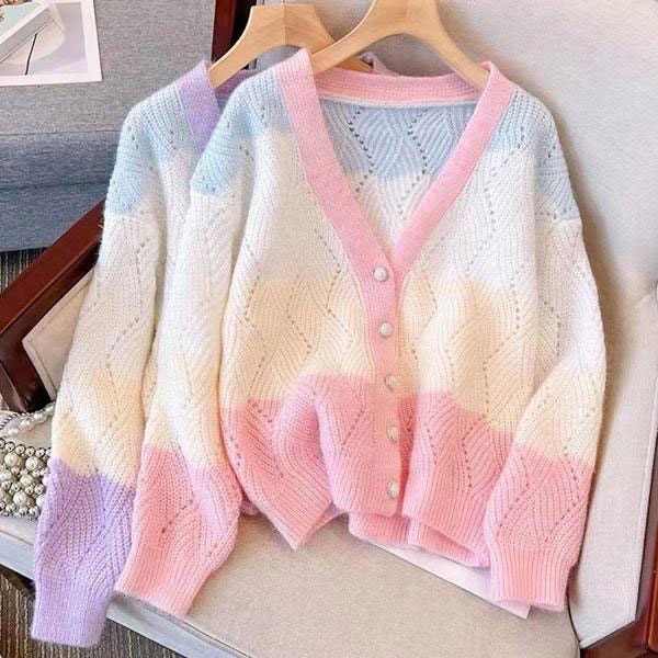 レディース 透かし編み 長袖ニットカーディガン フリーサイズ 2カラー グラデーション かわいい 優雅 程よい抜け感 おしゃれ こ...