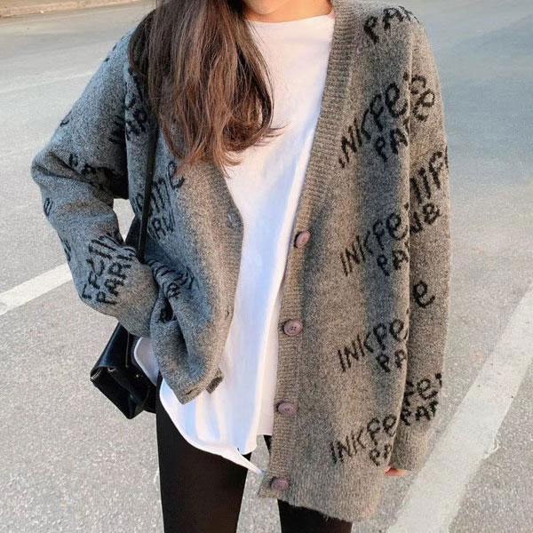 レディース Vネック 長袖デザイン 英字ニットカーディガン リラックス感 オーバーサイズ ジャケット 羽織れる 季節の変わり目 カ...