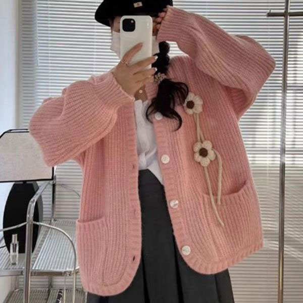 レディース フラワーモチーフ ゆったり カーディガン フリーサイズ 4カラー レトロ 可愛らしい ゲージ太め 暖かい スカート パ...