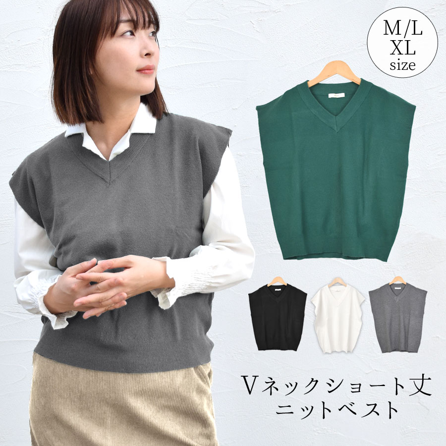 ニットベスト Vネック ショート丈 ベスト レディース トップス ノースリーブ きれいめ コンパクト 【送料pt100】