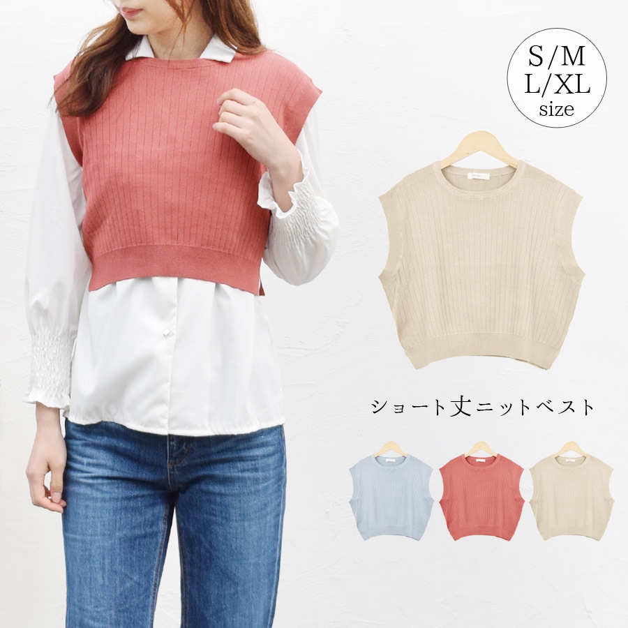 ニットベスト ショート丈 ニット ベスト クルーネック 丸首 レディース トップス ノースリーブ 【送料pt100】