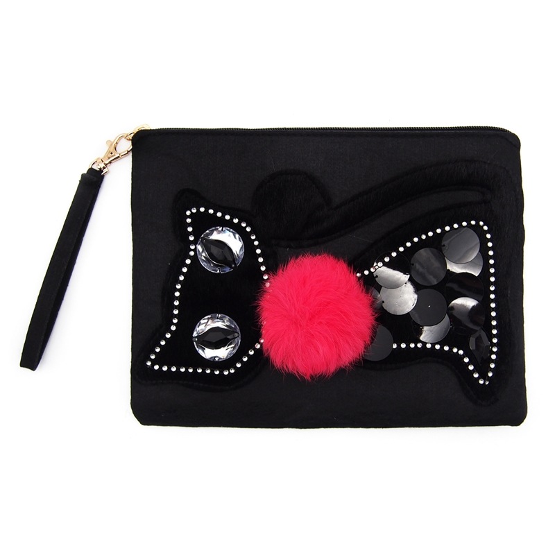 ファスナー平ポーチ 中44(ブラック×イエロー)ふわふわ中綿入りスマートフォン モバイル周辺機器収納に