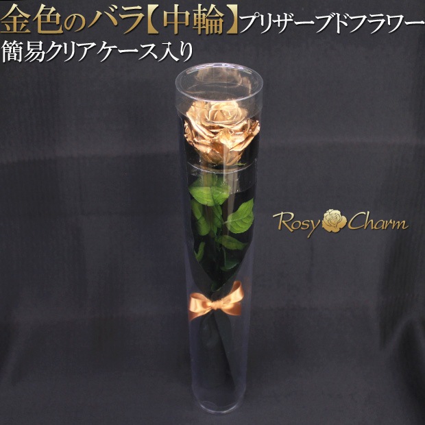 金色のバラ 【中輪】 プリザーブドフラワー 一本| 簡易クリアケース入り|枯れない花一輪の薔薇