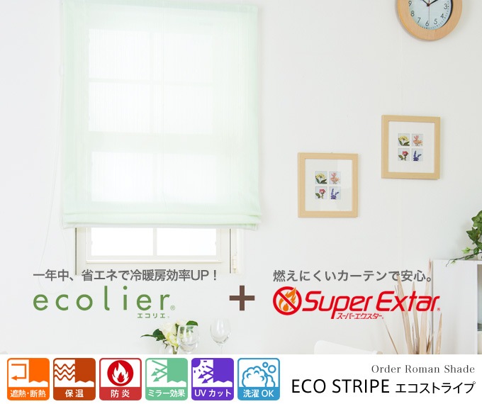 【幕体のみ】エアコン効率アップ! ストライプ柄防炎 省エネミラーレース ローマンシェード(グリーン)【買い替え用】