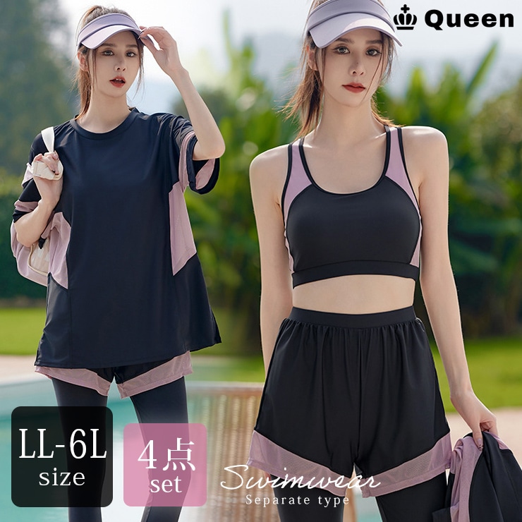 メッシュ切り替えフィットネス水着4点セット LL 3L 4L 5L 6L (m1106)