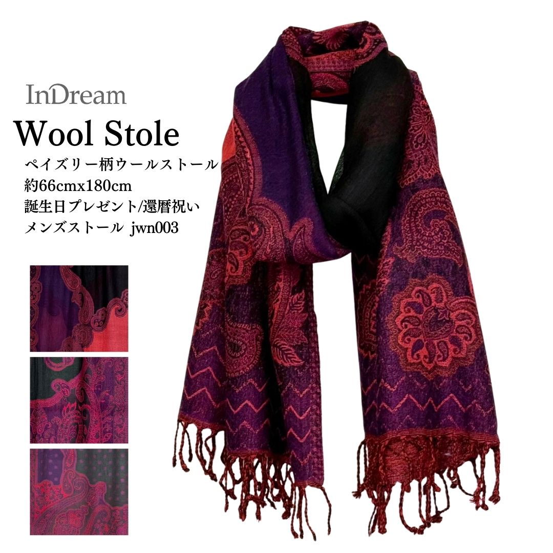 InDream ペイズリー柄 ウール ストール 大判 [65cmx190cm]赤 ダーク レッド 還暦祝い 誕生日 プレゼント ク...