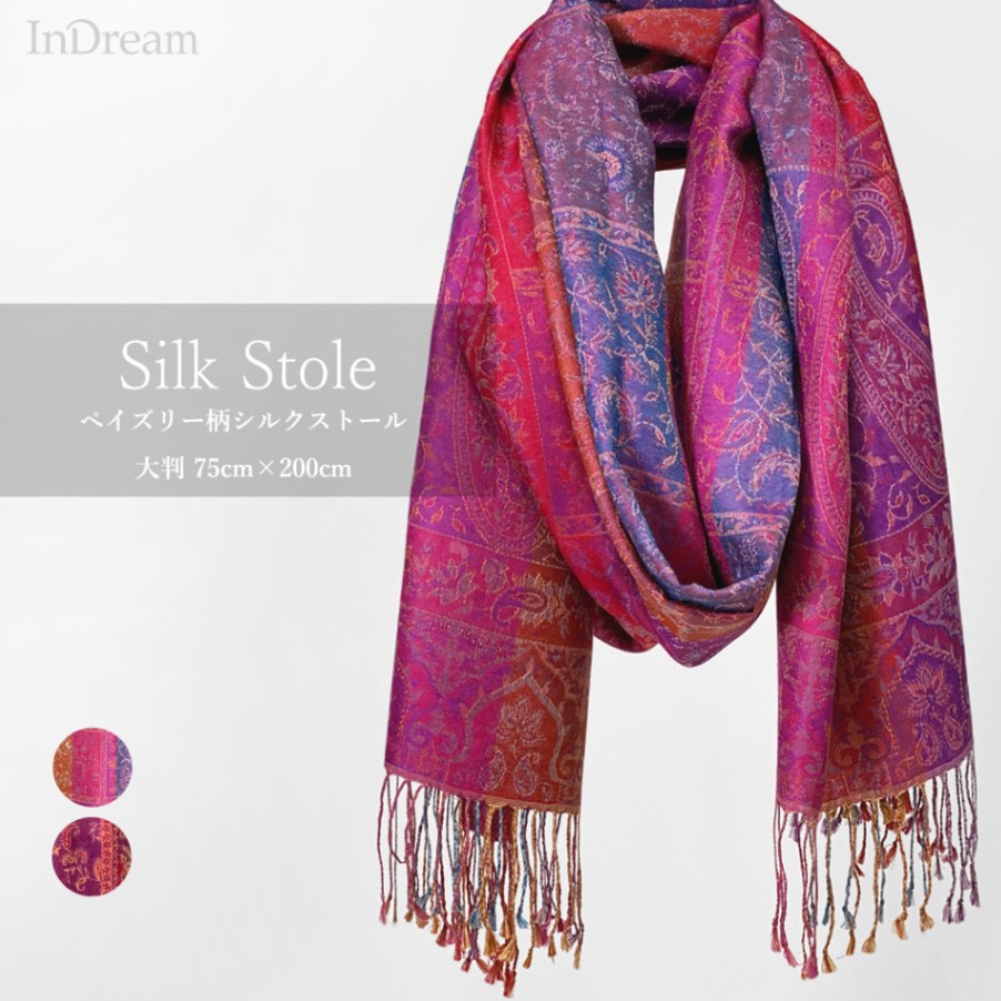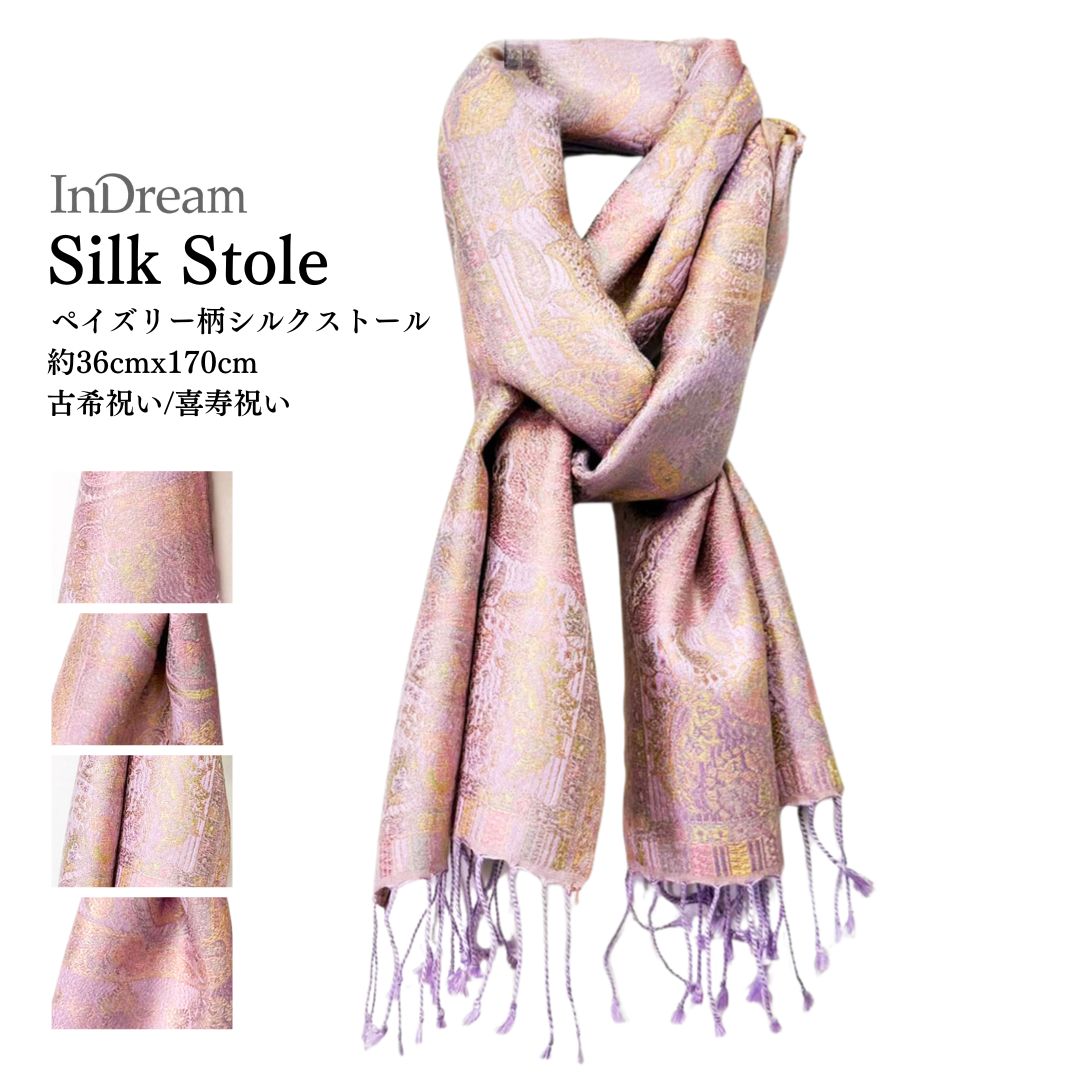 InDream ペイズリー柄 シルク ストール 大判 75cmx200cm ショール パープル ピンク 古希 お祝い 着物 クリス...