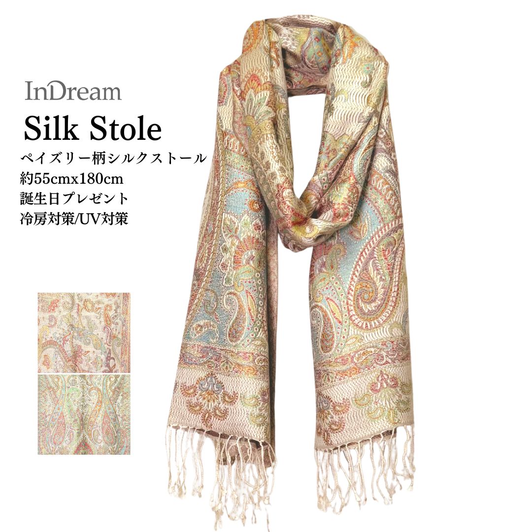 InDream ペイズリー柄 シルク ストール 大判 70cmx200cm ショール メンズ ベージュ 春 秋冬 クリスマス ギ...