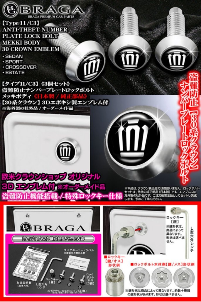 盗難防止ナンバープレート ロックボルト純正品【30系クラウン3Dエンブレム付/海外社外品/客注品】メッキボディ[タイプ11/C3]...