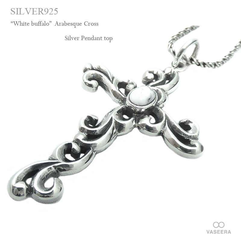 ホワイトバッファロー埋め込み 全長60mm 透かし彫りアラベスク(唐草) クロス シルバー ペンダント トップ 【シルバー925/...