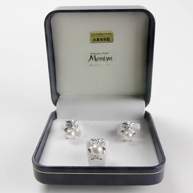 お洒落好きの方へフクロウのSV高級カフス。7ミリパールとサファイアの目がポイント。話題性抜群のプレゼントに【あこや真珠】