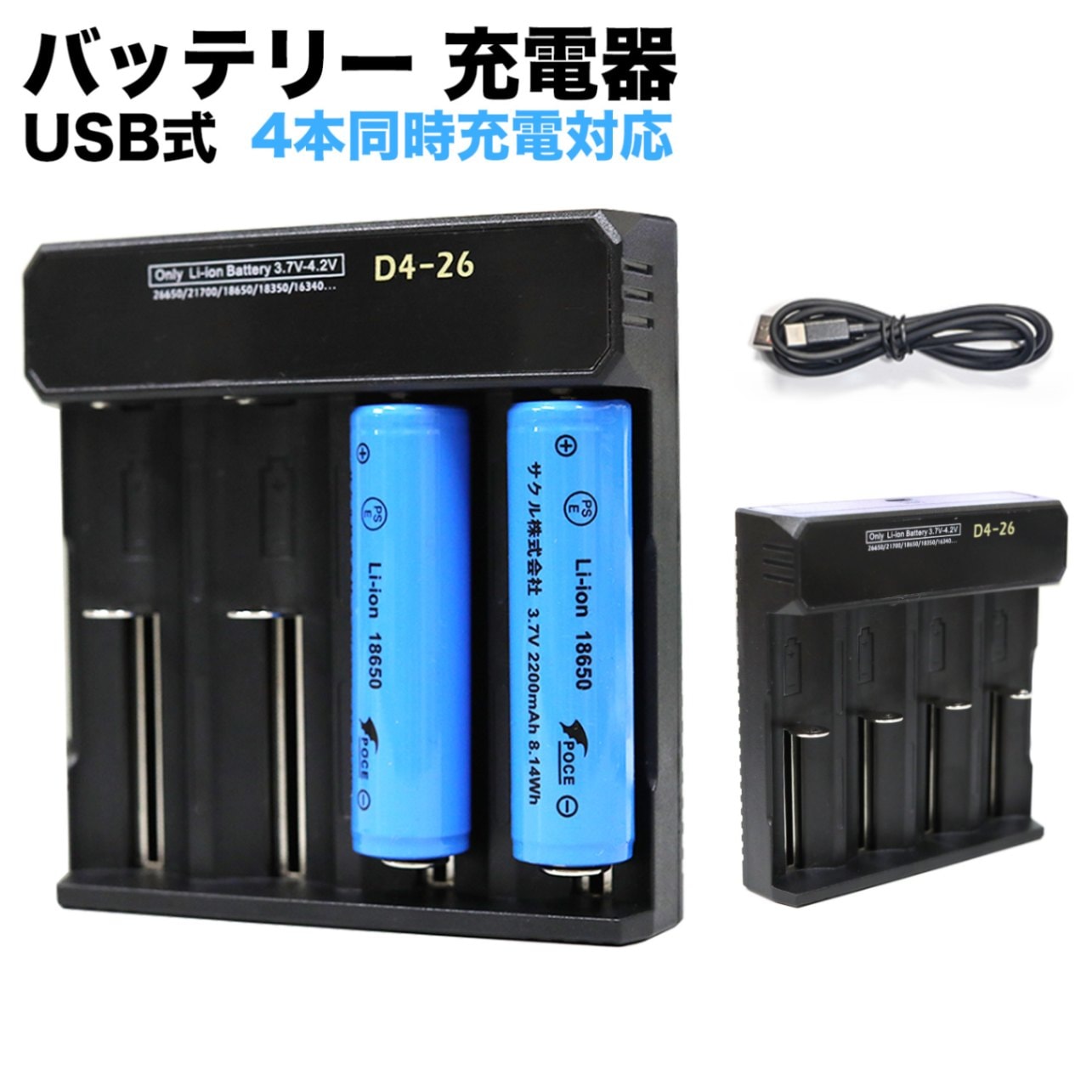 リチウム電池充電器 USB式 4スロット バッテリー チャージ 18650用 充電器 16340/16650/17650/1767...