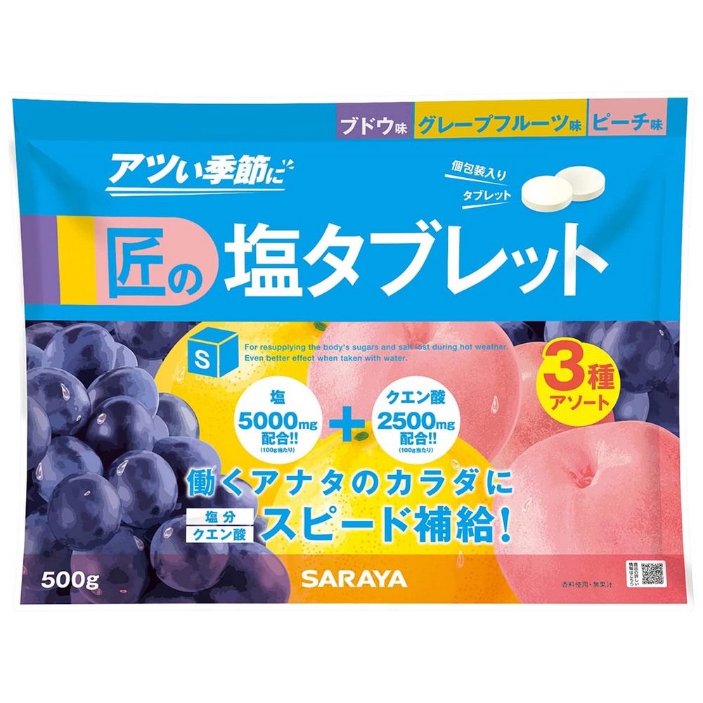 【完売しました】サラヤ 匠の塩タブレット 3種アソート(ブドウ味・グレープフルーツ味・ピーチ味) 500g×10袋入●ケース販売お...