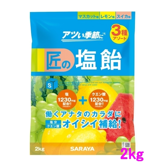 【完売しました】サラヤ 匠の塩飴 3種アソート(マスカット味・レモン味・スイカ味) 2kg×4袋入●ケース販売お徳用【取り寄せ商品...