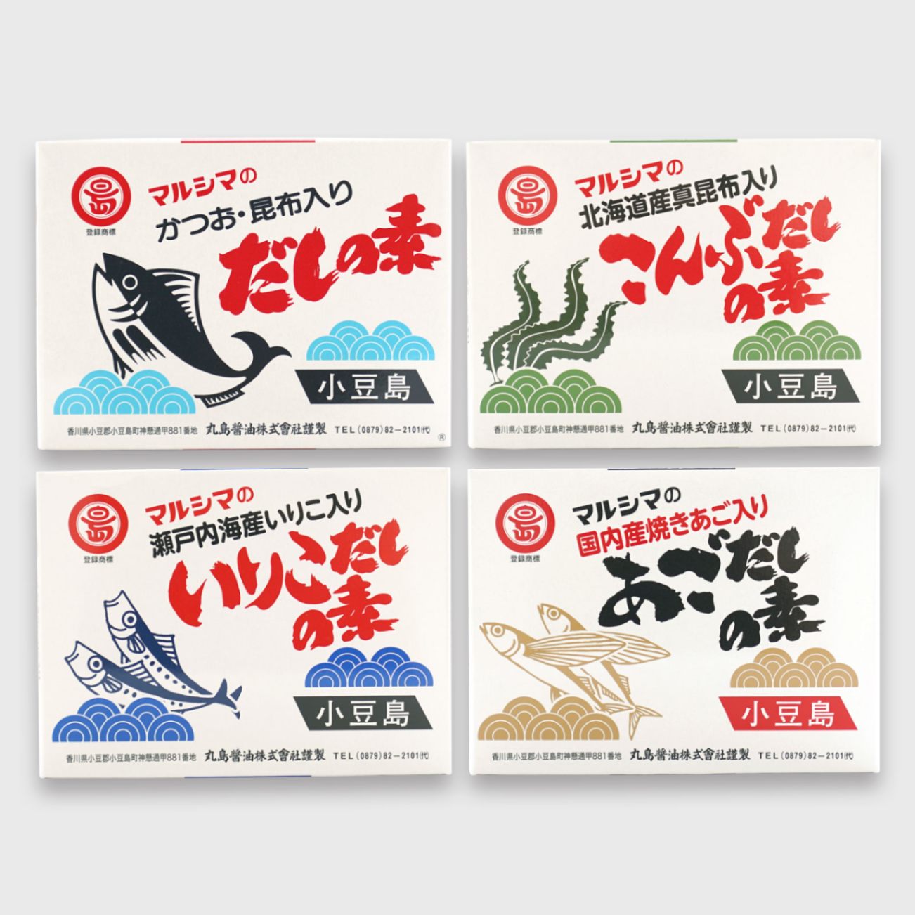 丸島醤油 マルシマのだしの素 4種セット【かつお160g/こんぶ128g/いりこ128g/あご128g】 単品 4箱 送料無料