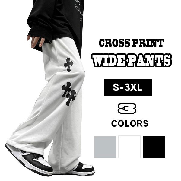 【即納】 メンズ クロスプリント ワイドパンツ モノトーン デザイン クール ストリート系 お洒落 春 秋