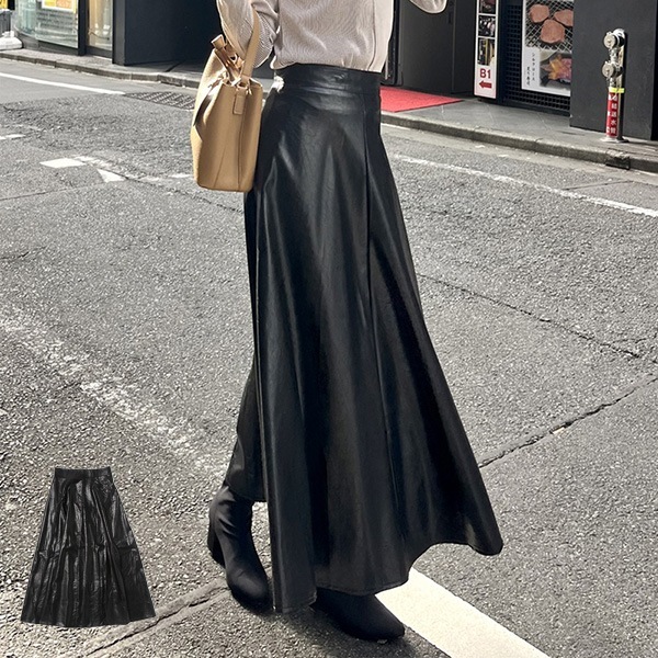 フェイクレザーロングフレアスカート