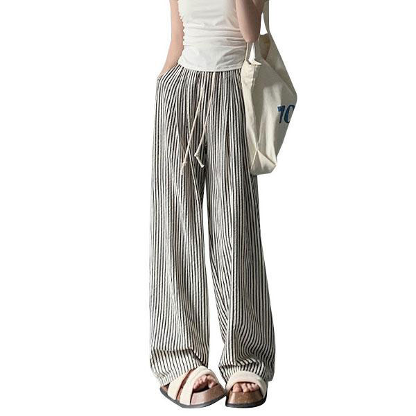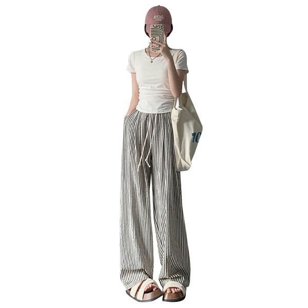 レディース ワイドパンツ 163cm以下丈 ストライプ ウエストゴム ゆったり 涼やか ハイウエスト パンツ ズボン ボトムス カ...