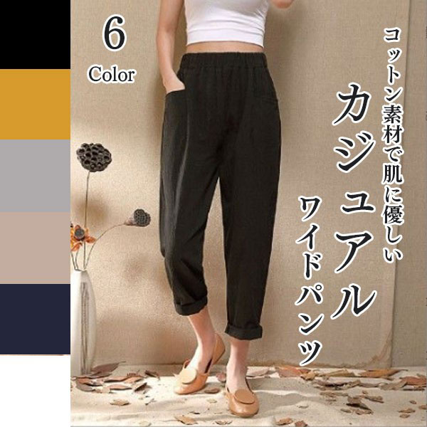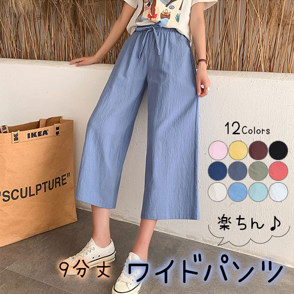 【セール】ワイドパンツ ガウチョパンツ レディース 9分丈 カジュアル ゆったり ウエストゴム 綿麻 シワ加工