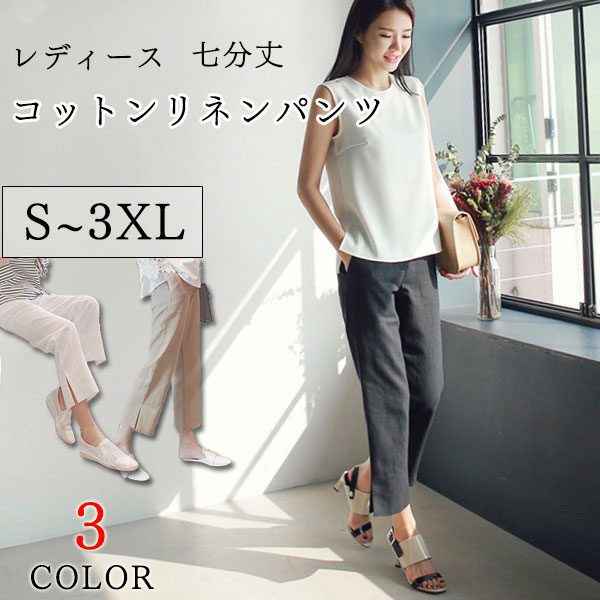 【セール】レディース クロップドパンツ 七分丈 コットンリネン素材 サイドスリット テーパード ストレート シンプル オフィス 通...