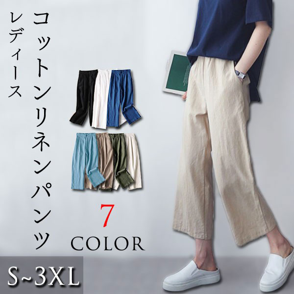 【セール】レディース 九分丈 クロップドパンツ コットン素材 リネン混 ウェストゴム リラックス 大人カジュアル