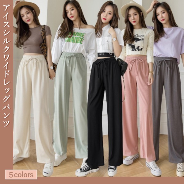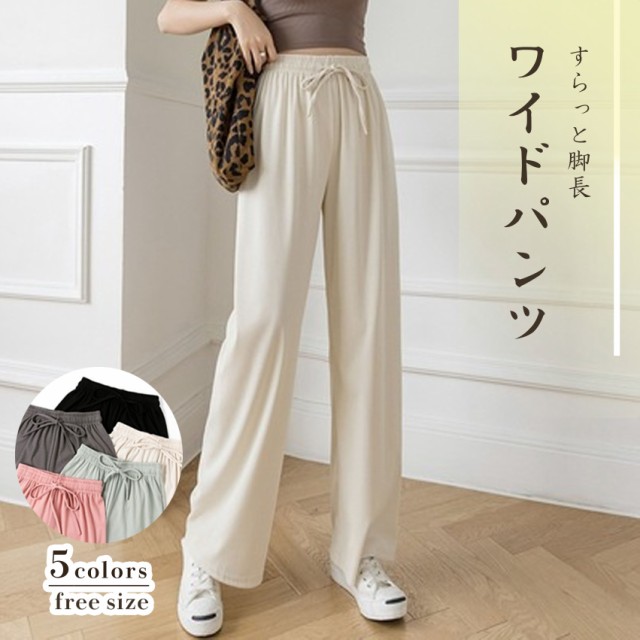 【セール】【即納】レディース ボトムス ワイドパンツ ハイウエスト すらっと脚長 紐付き ウエストゴム ゆったり 美脚 無地 シン...