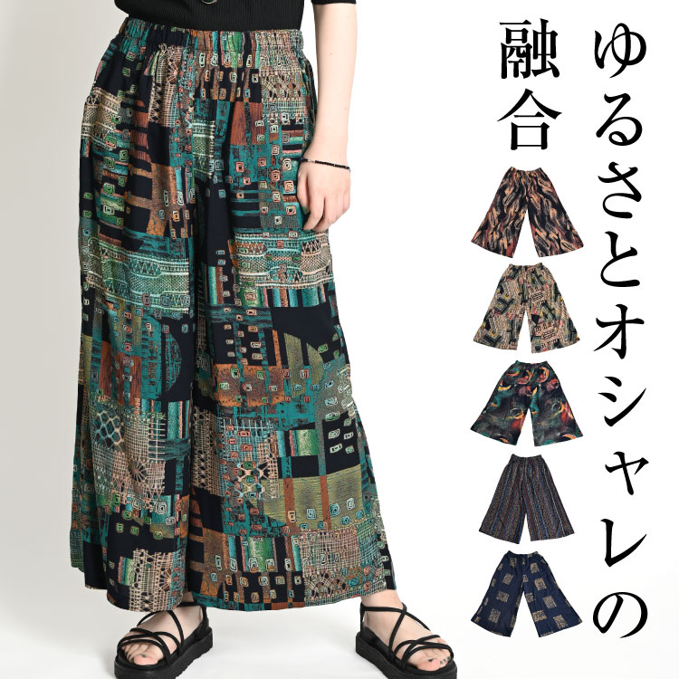 ゆるく、オシャレに。総柄ワイドパンツワイド パンツ レディース 春 夏 ワイド ロング パンツ ボトムス 柄 総柄 ストレートパン...