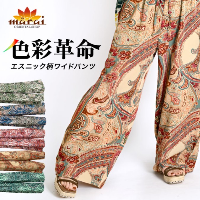 ワイドパンツ レディース ボトムス 日常に色彩革命。エスニック柄ワイドパンツ 柄物 アジアン 大人 プリント ゆったり フレア 体...