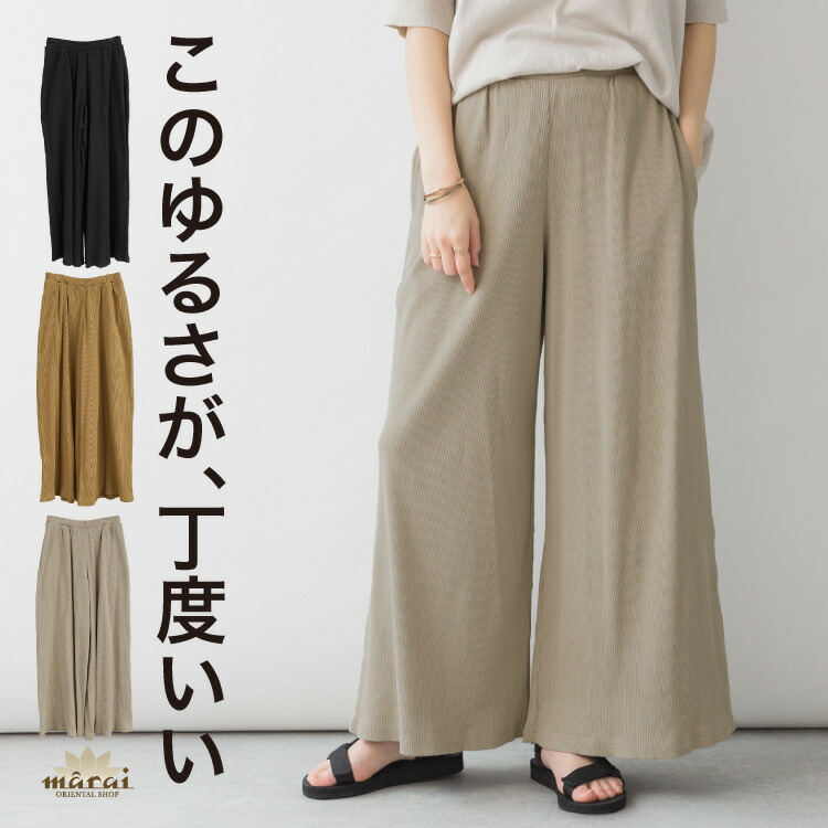 リブ ワイドパンツ 綿 レディース このゆるさが、丁度いい。紐付きゆったりリブワイドパンツ リブパンツ ロングパンツ ロング丈 M...