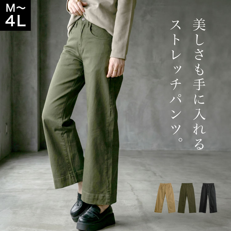 ワイドパンツ レディース ストレッチパンツ きれいめ ガウチョパンツ 大きいサイズ カラーツイルパンツ ボトムス コットン M L...