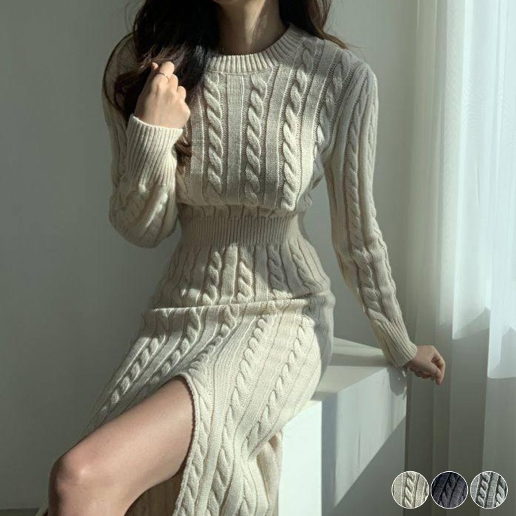 クロスネック 切り替え ケーブル編み ニット ミニワンピース