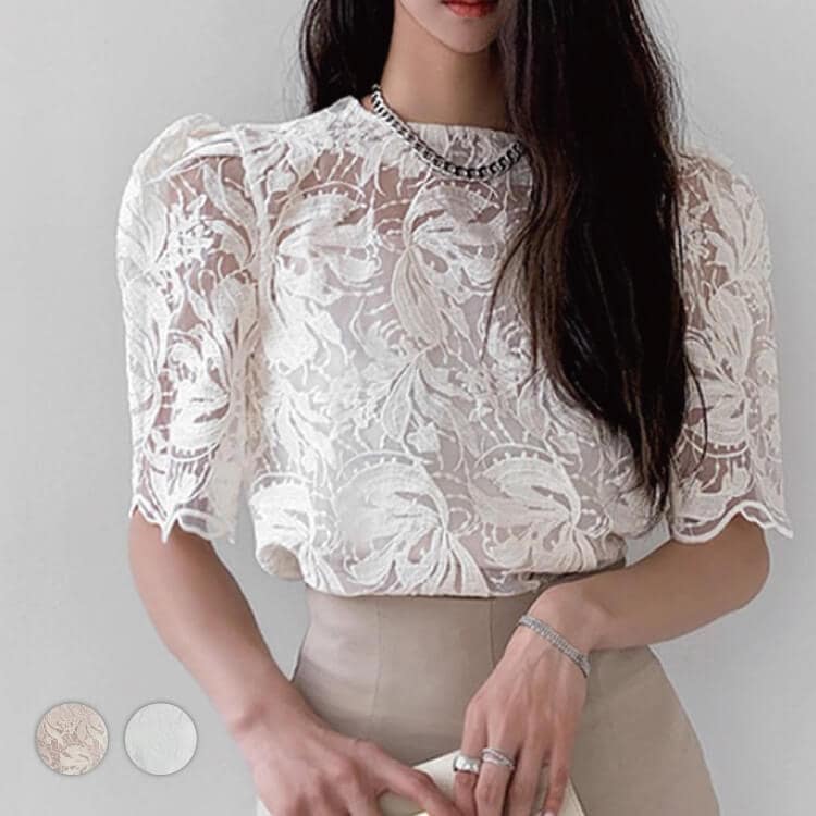 ブラウス シアー 刺繍 レース 韓国 五分袖 トップス