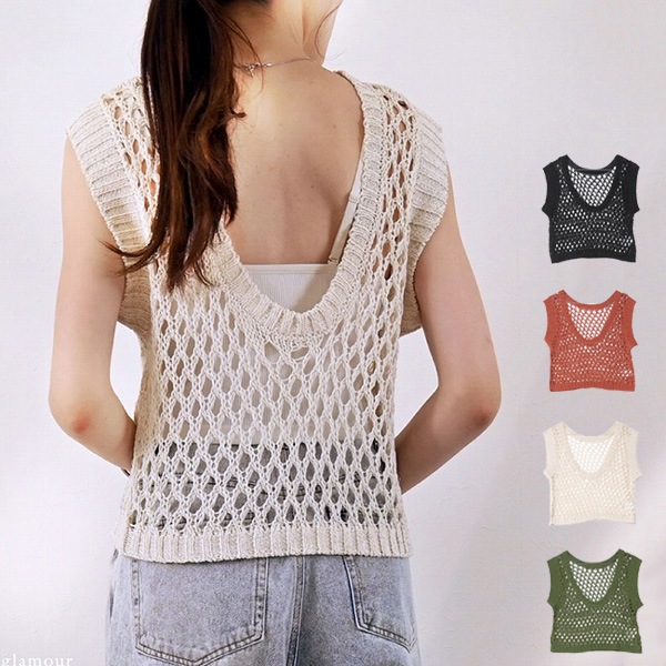 麻タッチUネック2WAYメッシュニットベスト