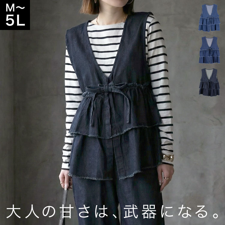 デニム ベスト レディース フリル ティアード ジレ リボン 春 夏 秋 大きいサイズ ゆったり 綿100% レイヤード 重ね着 ...