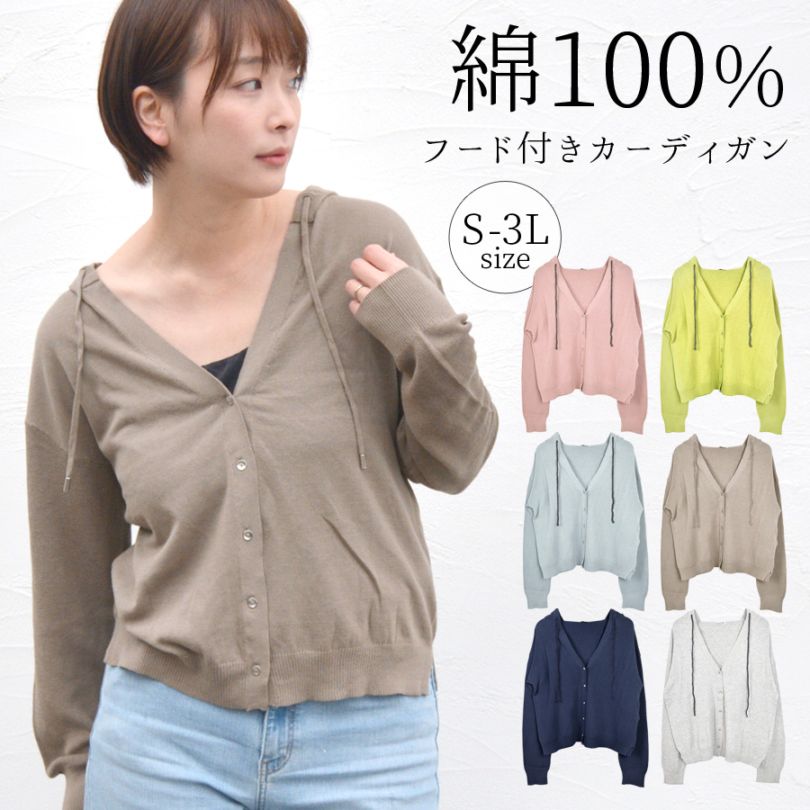 ニットパーカー カーディガン 春夏 フード レディース 綿100 トップス 長袖 パーカー フード付き 【送料pt100】