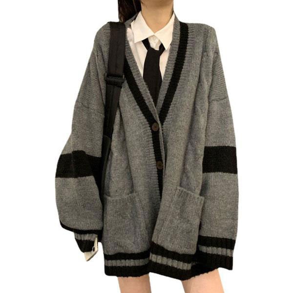レディース 長袖 ビックシルエット Vネックカーディガン ライン入り フリーサイズ オーバーサイズ トレンド感 ライトアウター 韓...