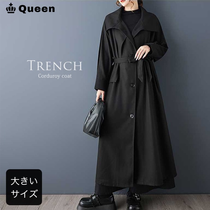コーデュロイバックボタントレンチ風コート(ウエストリボン付き) 大きいサイズ レディース (48568)