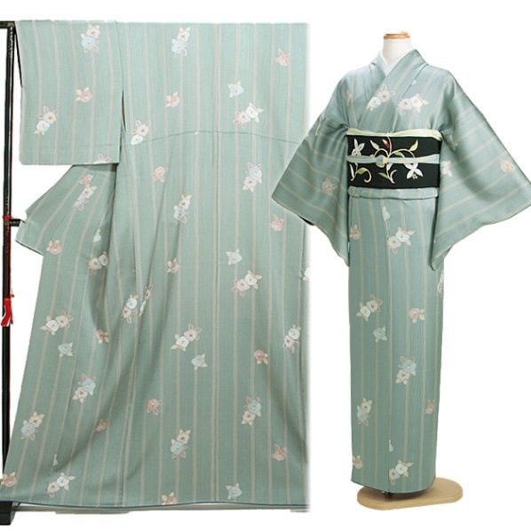 色無地 レンタル 袷 10月~5月向け 高級正絹 薄みどり色 着物 一つ紋 お宮参り FDD0025