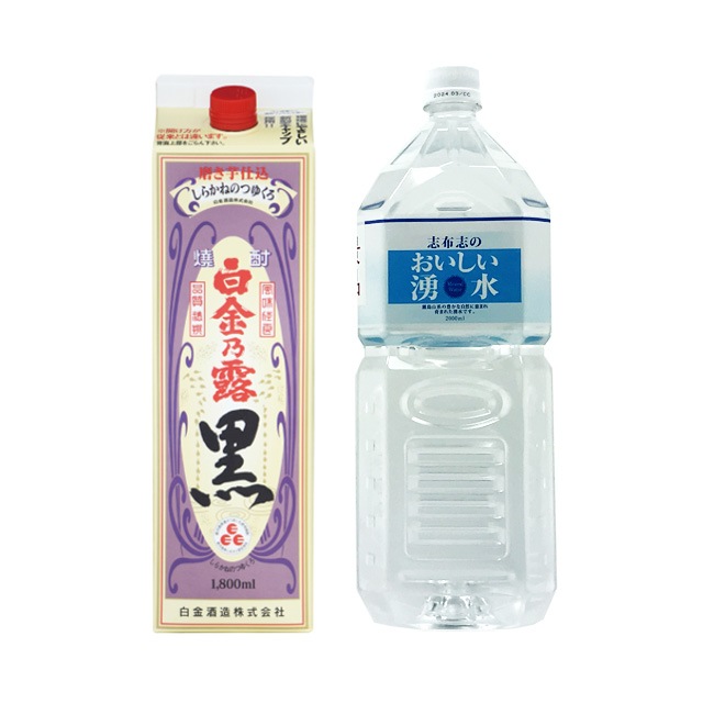 白金乃露 黒 パック 25度 1800ml 芋焼酎+志布志の湧水2L セット 白金酒造